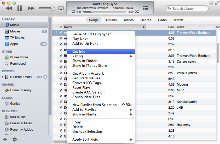 2. Select song, right-click mouse and select "Get info".