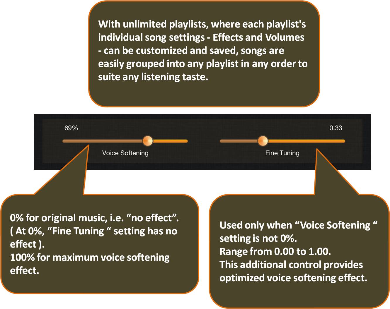 Tip: Start karaoke effect by moving left slider to soften voice immediately, but purposely leave a little voice alive. Then, adjust right slider to warm up midrange music and at the same time optimizing voice reduction further. Please note that optimal point may vary between songs.